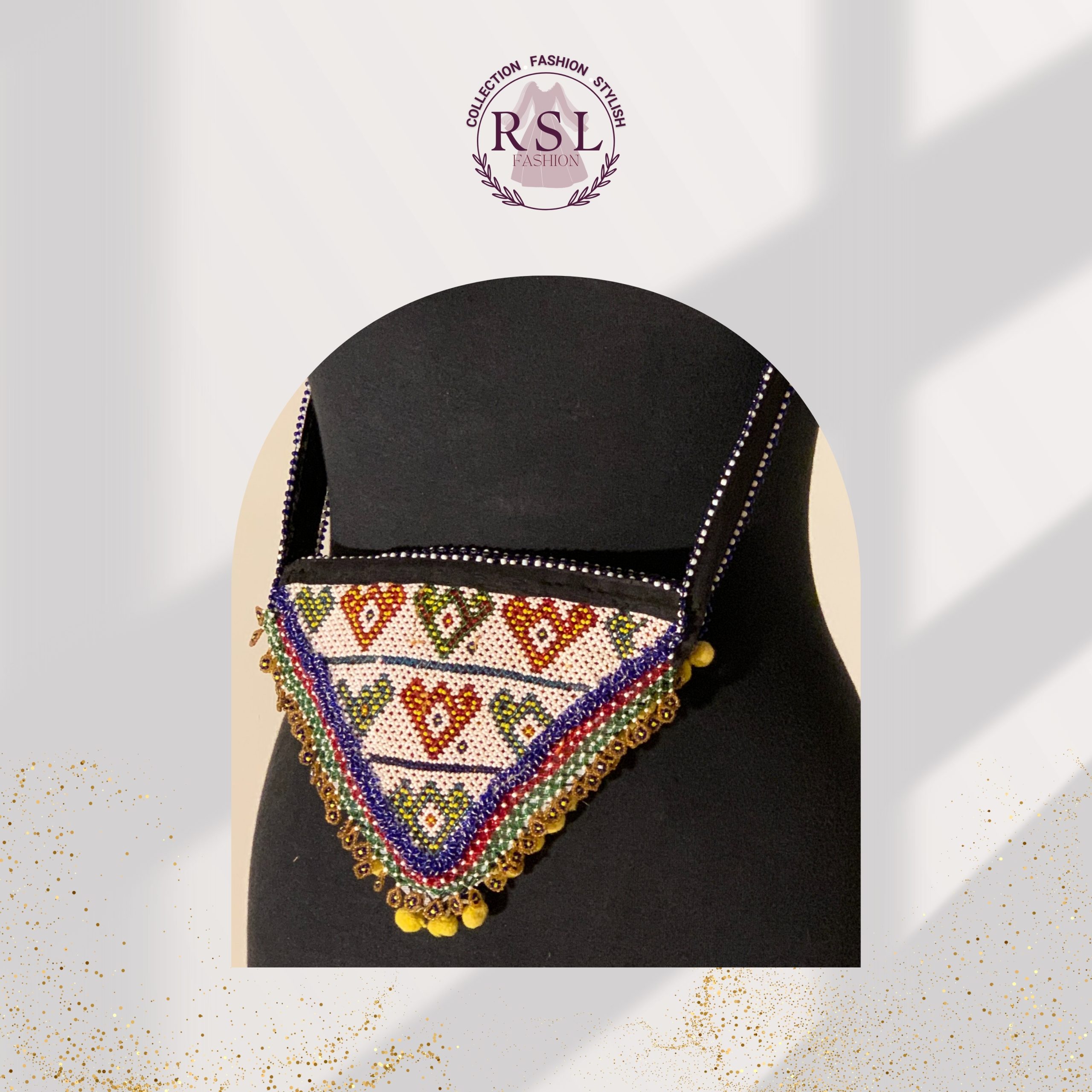 The Afghan Heartline Cascade Beaded Purse is a heartfelt expression of tribal artistry, delicately crafted in a compact inverted triangle shape and designed for ceremonial wear or celebratory gifting. Set against a pure white beaded base—symbolizing sincerity and clarity—the purse features three horizontal rows of colorful heart motifs in green, red, mustard, and maroon. These hearts reflect themes of love, family ties, and joyful connection, often interpreted as blessings passed down through generations. A soft blue divider in the center visually separates past and present, while the lower section features downward-pointing diamond-heart hybrids that symbolize grounded affection or the roots of love. The outer edges boast a beautifully layered fringe of blue, purple, green, and red beads, cascading like waves or a woven rainbow, reinforcing the sense of emotional richness. Yellow pom-poms and golden drop beads add playful motion and a festive aura—especially suited to young girls, wedding attendees, or as symbolic gifts during cultural celebrations. With its tight beadwork, gentle symmetry, and vibrant palette, this purse showcases a master artisan’s attention to emotional storytelling through design. The Afghan Heartline Cascade Beaded Purse is a rare, meaningful piece—celebrating love, femininity, and the joy of tribal traditions.