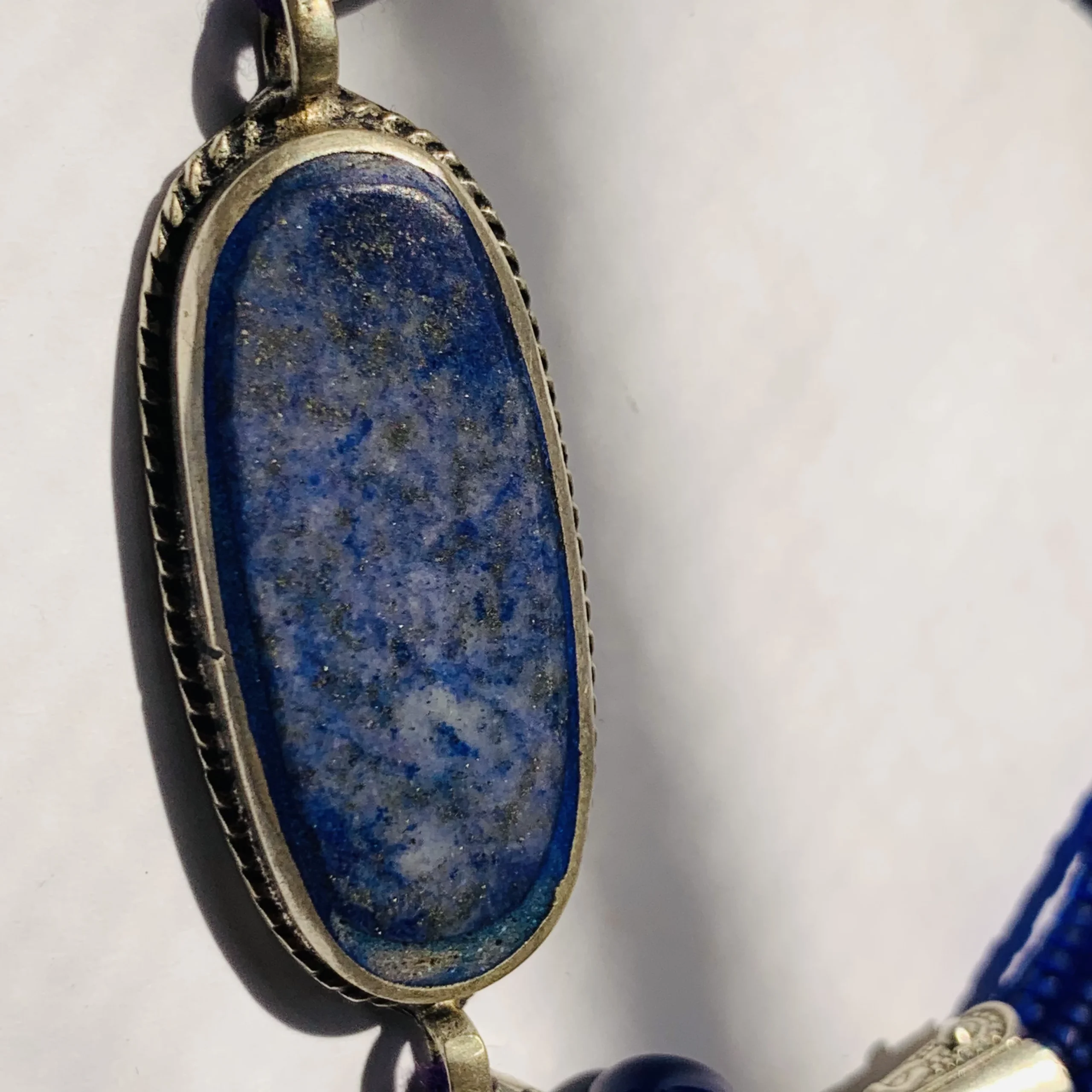 This Afghan Lapis Lazuli Multi-Strand Bracelet is a striking tribute to traditional Afghan craftsmanship, featuring layers of deep blue lapis beads paired with a prominent oval lapis lazuli centerpiece. The multiple strands create rich texture and movement, while the vibrant lapis stones—prized for their natural beauty and symbolic connection to wisdom and protection—bring a sense of depth and serenity. Hand-assembled with care, this bracelet captures the bold elegance of tribal Afghan jewelry, perfect for those who appreciate artisan-made pieces with cultural significance. Finished with a secure clasp and adjustable fit, it’s a standout accessory for any occasion. A timeless blend of heritage, gemstone beauty, and handcrafted style.