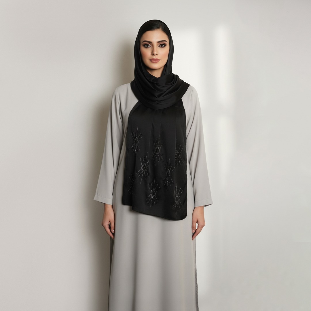 The Black Starburst Satin Scarf blends sophistication with subtle glamour. Made from smooth, glossy satin, it drapes beautifully and feels incredibly soft on the skin. The standout feature is its starburst crystal pattern, arranged delicately across the scarf to create a graceful sparkle effect. Lightweight yet luxurious, this scarf is perfect for formal gatherings, weddings, festive nights, or pairing with abayas for a polished modest look.