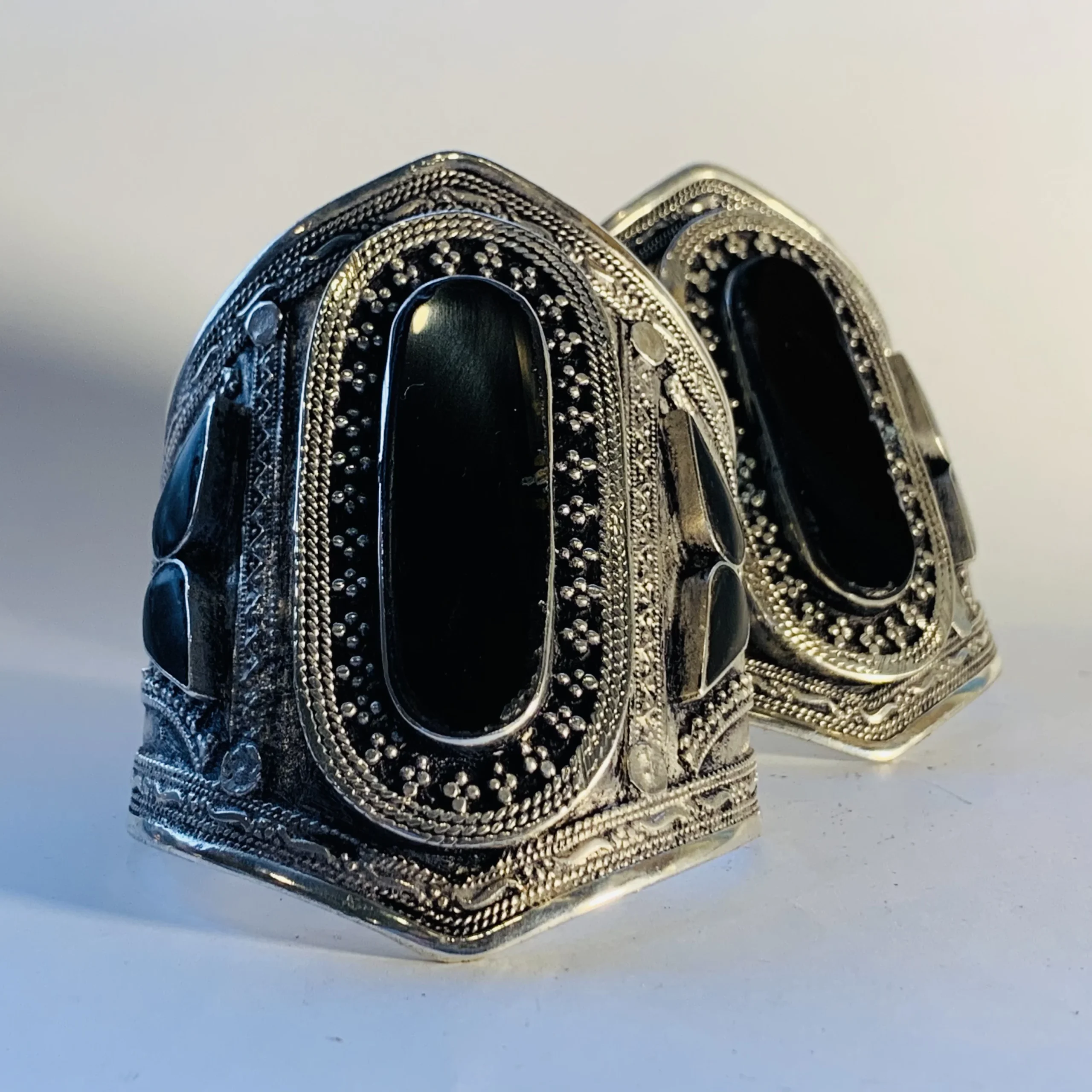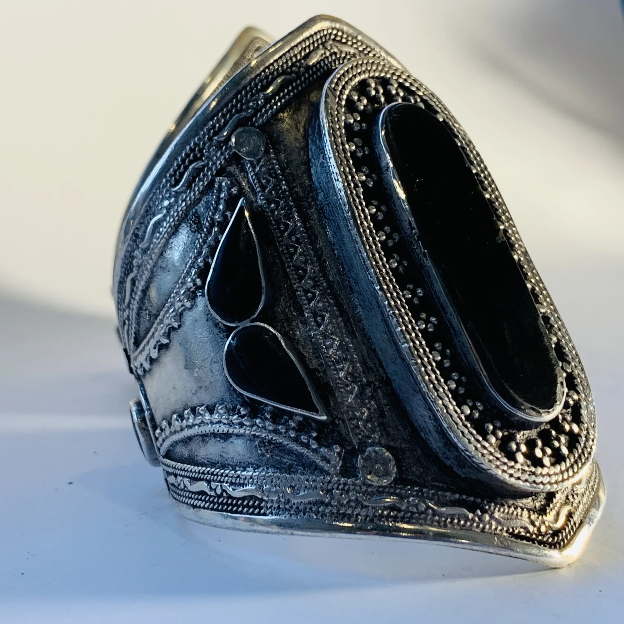 A striking tribal-inspired boho cuff bracelet, featuring a bold black stone set in detailed metalwork—perfect for earthy, free-spirited styling.