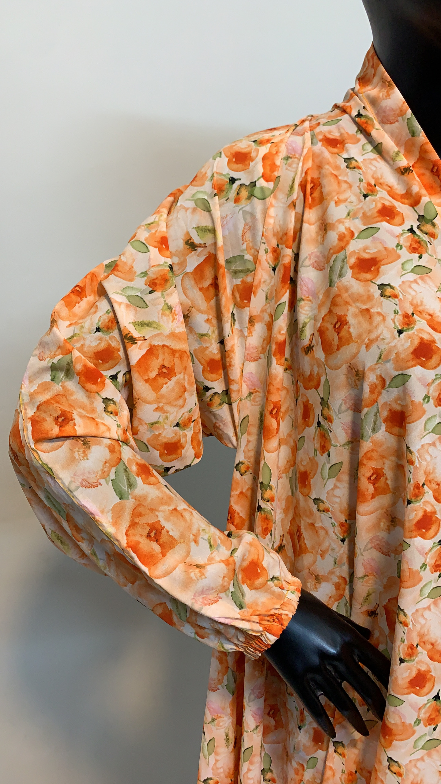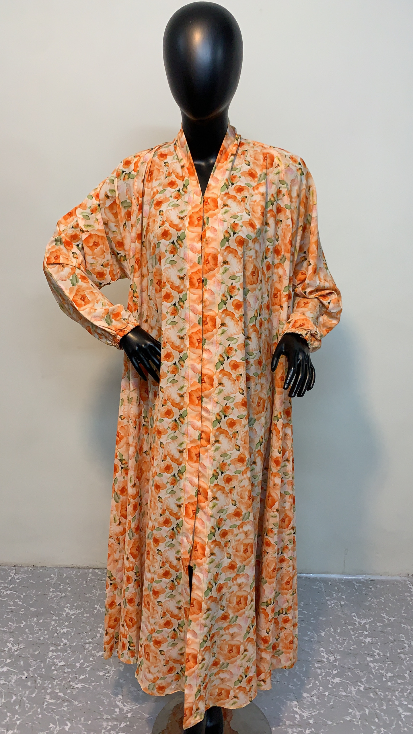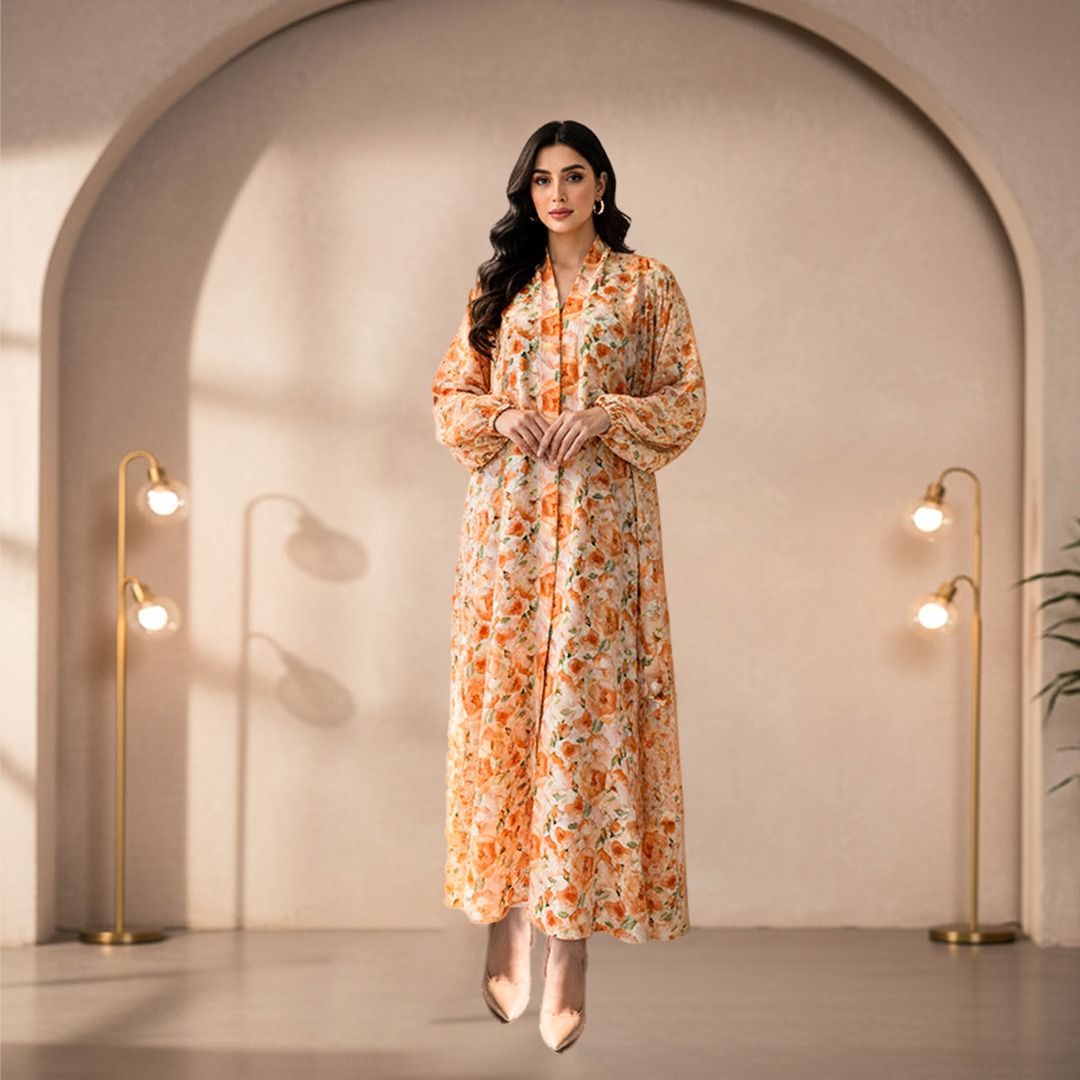 Designed with a modest, full-length silhouette, the abaya features a subtle inner button placket for versatile styling—wear it open for flow or closed for a polished finish. Gentle shoulder gathers add a touch of femininity and fluid movement, while the long tapered sleeves end in elastic or buttoned cuffs for a tailored yet comfortable wrist fit. The seamless continuation of the floral print across the sleeves creates unity in the design, making it visually balanced from every angle.