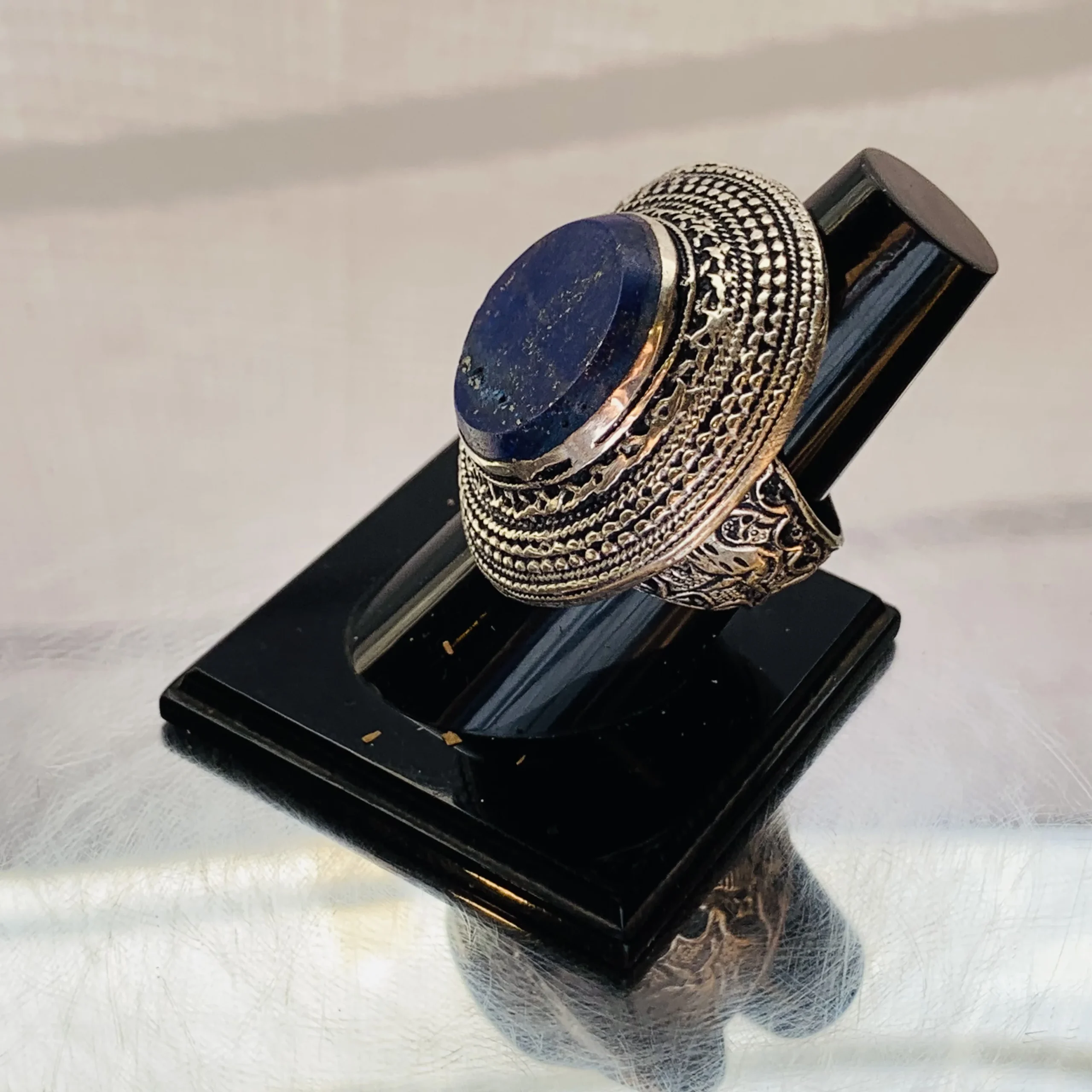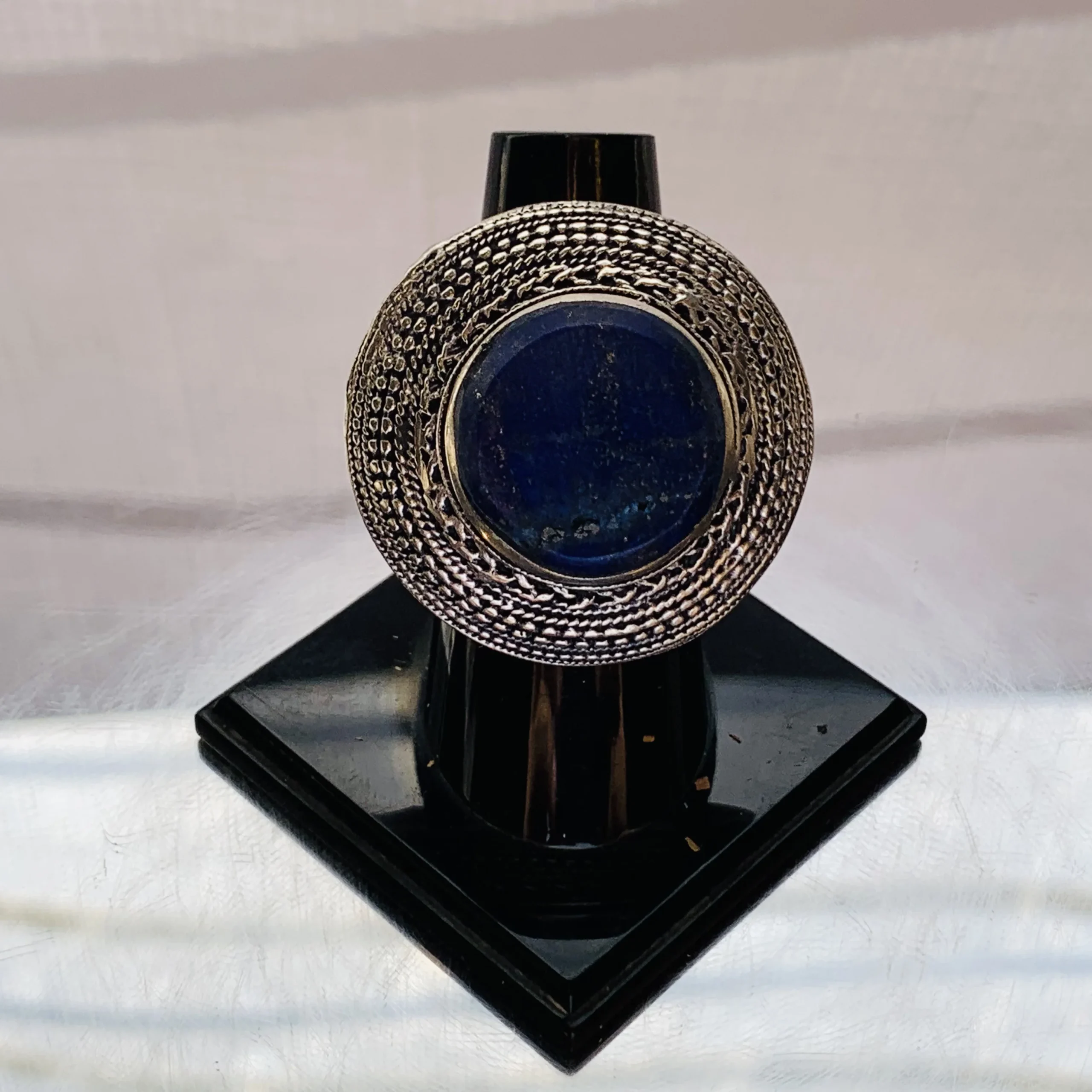 A bold Afghan ring featuring a deep dark blue round stone, set in a richly braided and textured antique-style frame—classic, handcrafted, and full of cultural depth.