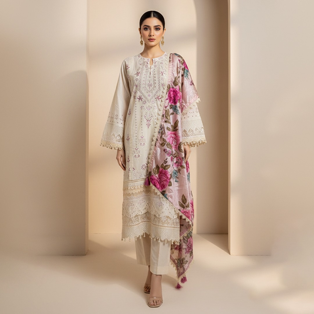 This beautiful 3-piece ensemble from RSL Fashion exudes timeless elegance and charm. Crafted from soft cream lawn fabric, the shirt features intricate pink thread embroidery with delicate lace detailing along the sleeves and hemline. The attention to detail and craftsmanship make it a perfect choice for women who appreciate both tradition and sophistication.