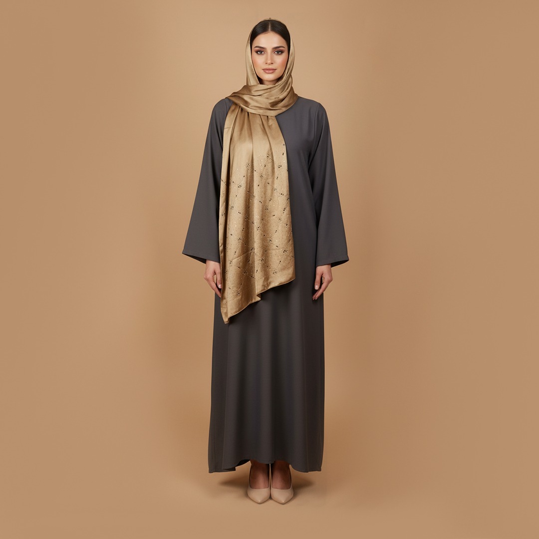 The Golden Shimmer Luxe Scarf brings elegance and radiance to any outfit with its luxurious satin finish and beautifully crafted detailing. Designed in a warm golden shade, the scarf features subtle cut-work patterns enhanced with fine shimmering embellishments that catch the light gracefully. The smooth, silky texture drapes effortlessly, making it an ideal choice for weddings, parties, evening gatherings, or pairing with abayas and ethnic wear.