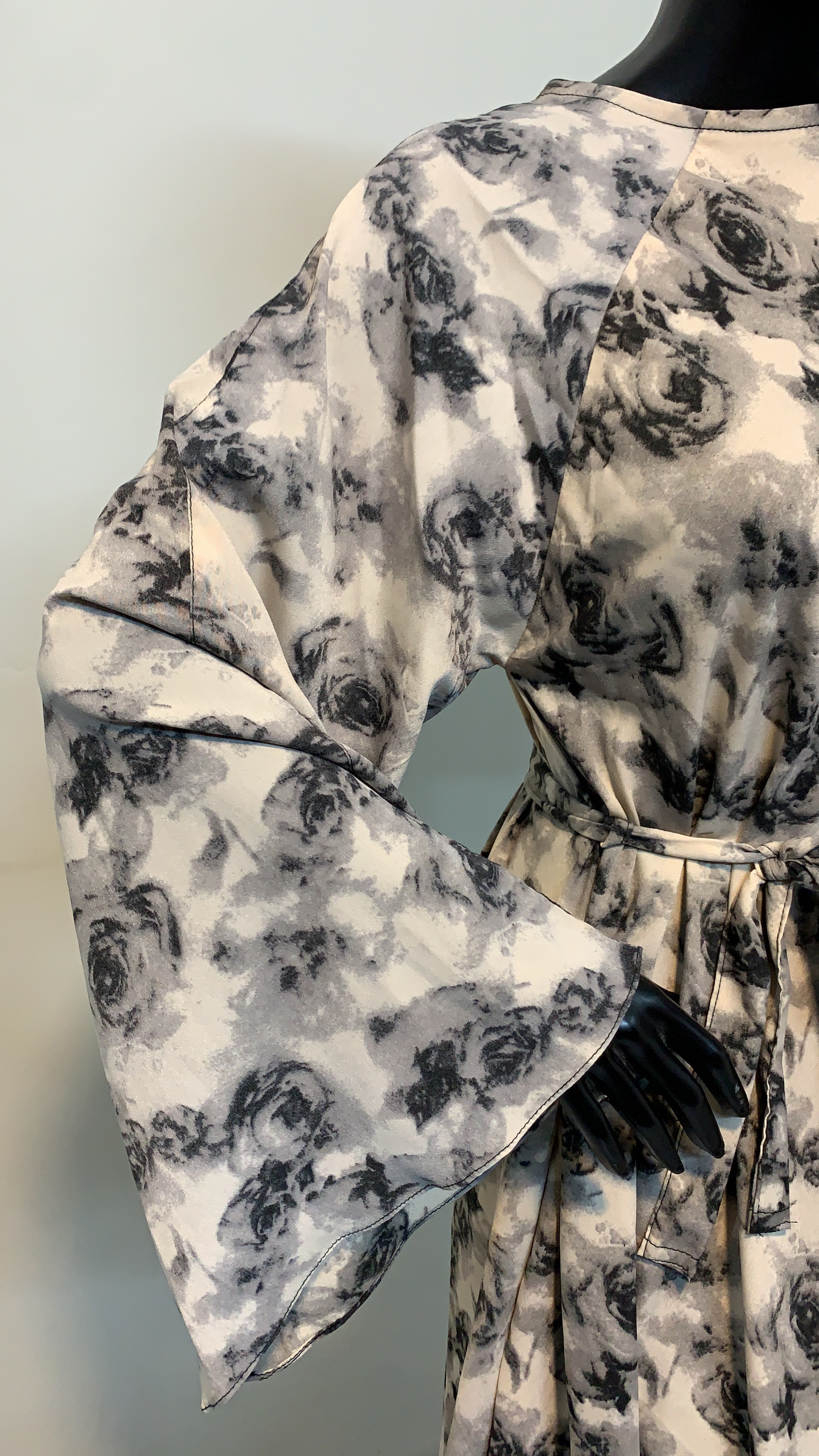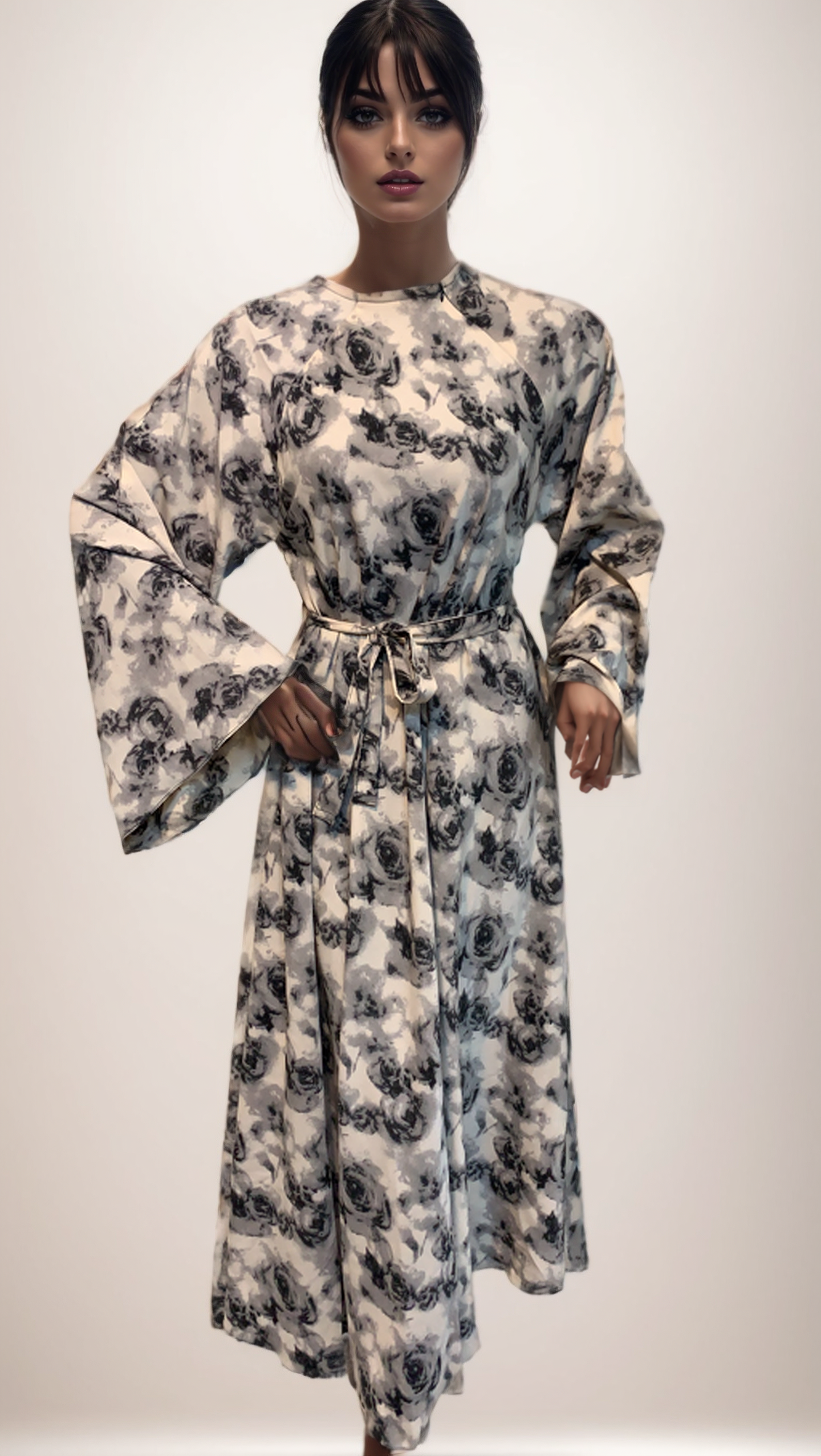 Cut in a classic closed-front silhouette, the round neckline keeps the look modest and flattering. A self-fabric belt allows for flexible styling—wear it loose for a flowing, ethereal effect or cinch the waist to create definition. The full-length hemline gently flares out, giving the abaya soft movement and feminine grace. Wide bell sleeves further enhance the silhouette, adding a dramatic, fashion-forward finish.