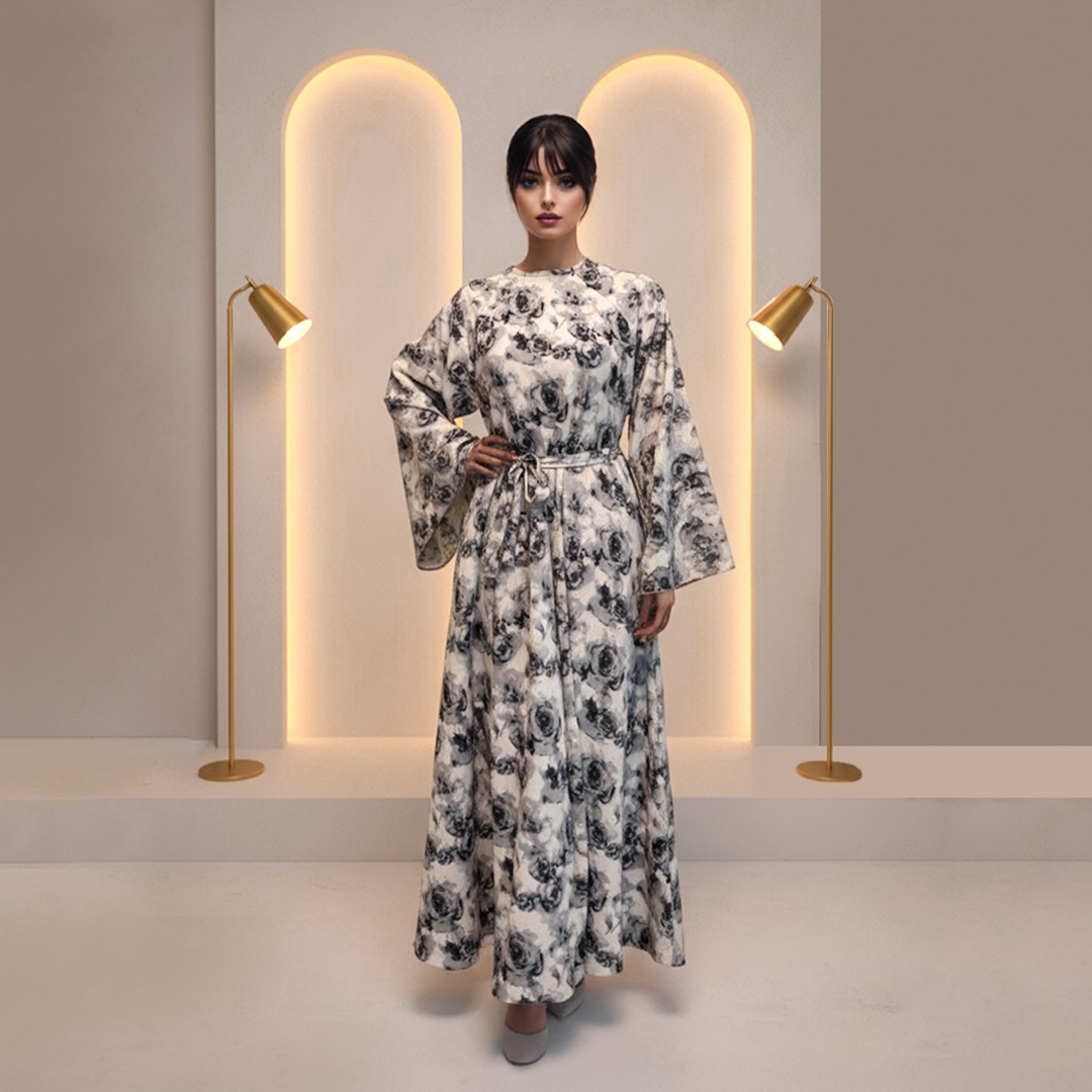 The Ivory Bloom – Monochrome Floral Abaya is a refined expression of romantic minimalism, merging timeless floral artistry with contemporary modest wear design. Draped in a graceful ivory base, this abaya features shaded black and charcoal floral patterns that mimic hand-illustrated botanical sketches—baroque-style roses and vine details spread evenly for a balanced, elegant aesthetic. The monochrome palette offers versatility and quiet sophistication, making it suitable for both casual and semi-formal occasions.