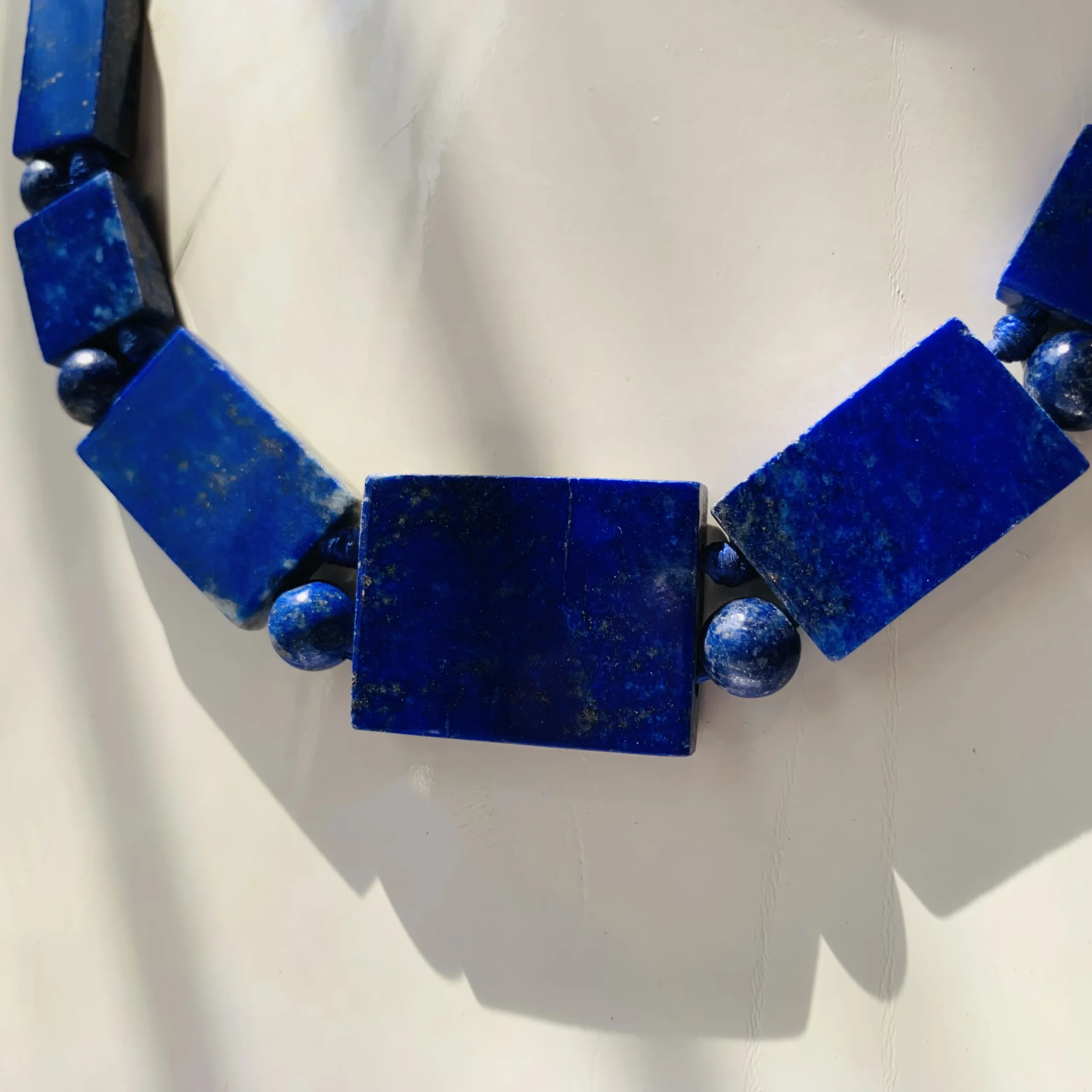 A handcrafted Afghan necklace featuring striking square-cut lapis lazuli stones, rich in deep blue tones and cultural heritage.