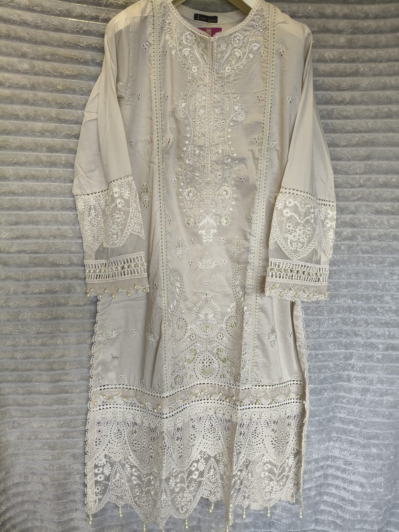 Lavender Whisper from the J. x RSL Exclusive Collection is the embodiment of soft elegance in premium lawn. The ivory shirt is adorned with exquisite white Chikankari embroidery along the neckline, sleeves, and front, complemented by delicate lace finishing for a handcrafted feel. Its digital floral print features soothing hues of lavender, plum, sage green, and blush pink, offering a dreamy palette perfect for summer. The dupatta echoes the floral softness, while the plain trousers complete the airy, refined look. Ideal for Eid brunches, day weddings, or garden parties, this ensemble brings comfort and class in every thread. Fully stitched and ready to wear, it offers effortless sophistication for the discerning wardrobe.