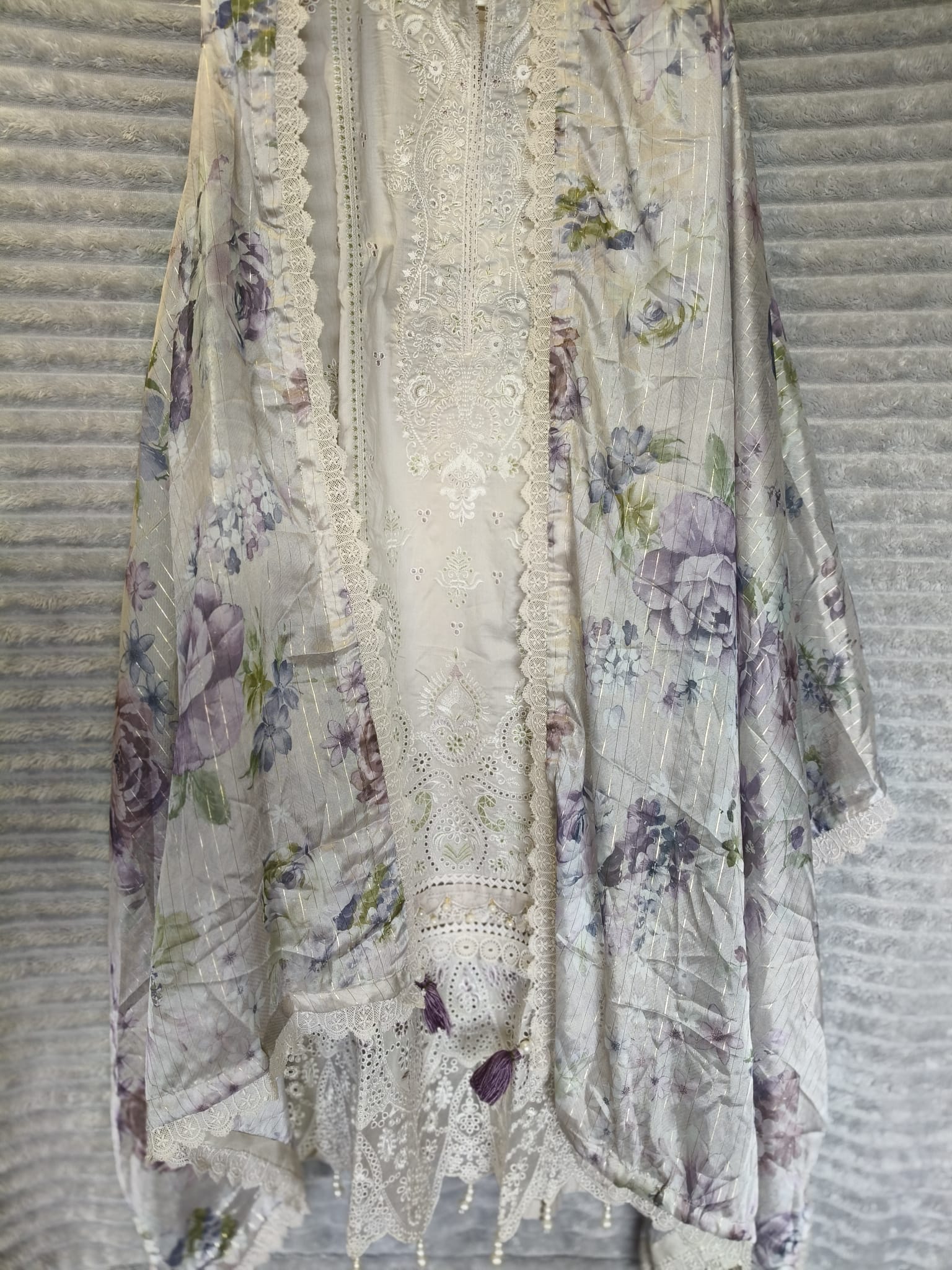 A luxury 3-piece lawn suit featuring delicate white Chikankari embroidery and soft floral prints in lavender and blush. Crafted for timeless elegance and summer grace.
