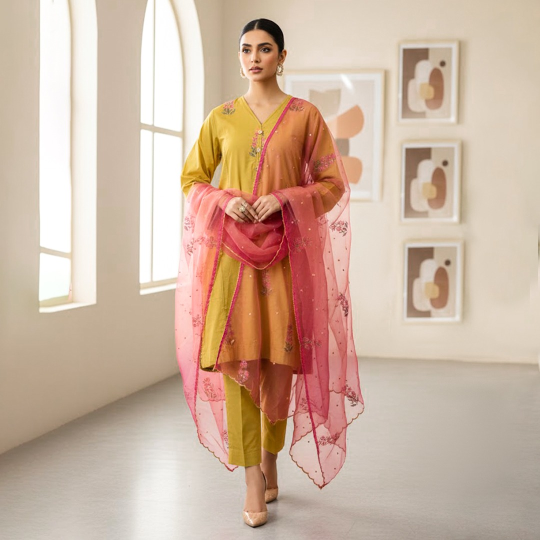 Paired with matching mustard trousers for a cohesive look and a contrasting pink chiffon dupatta, this outfit adds a refreshing pop of color to your style. Comfortable, elegant, and effortlessly graceful — it’s ideal for casual gatherings, festive lunches, or daytime wear.