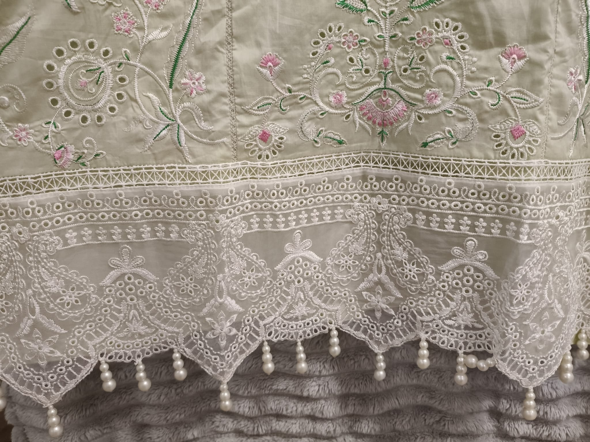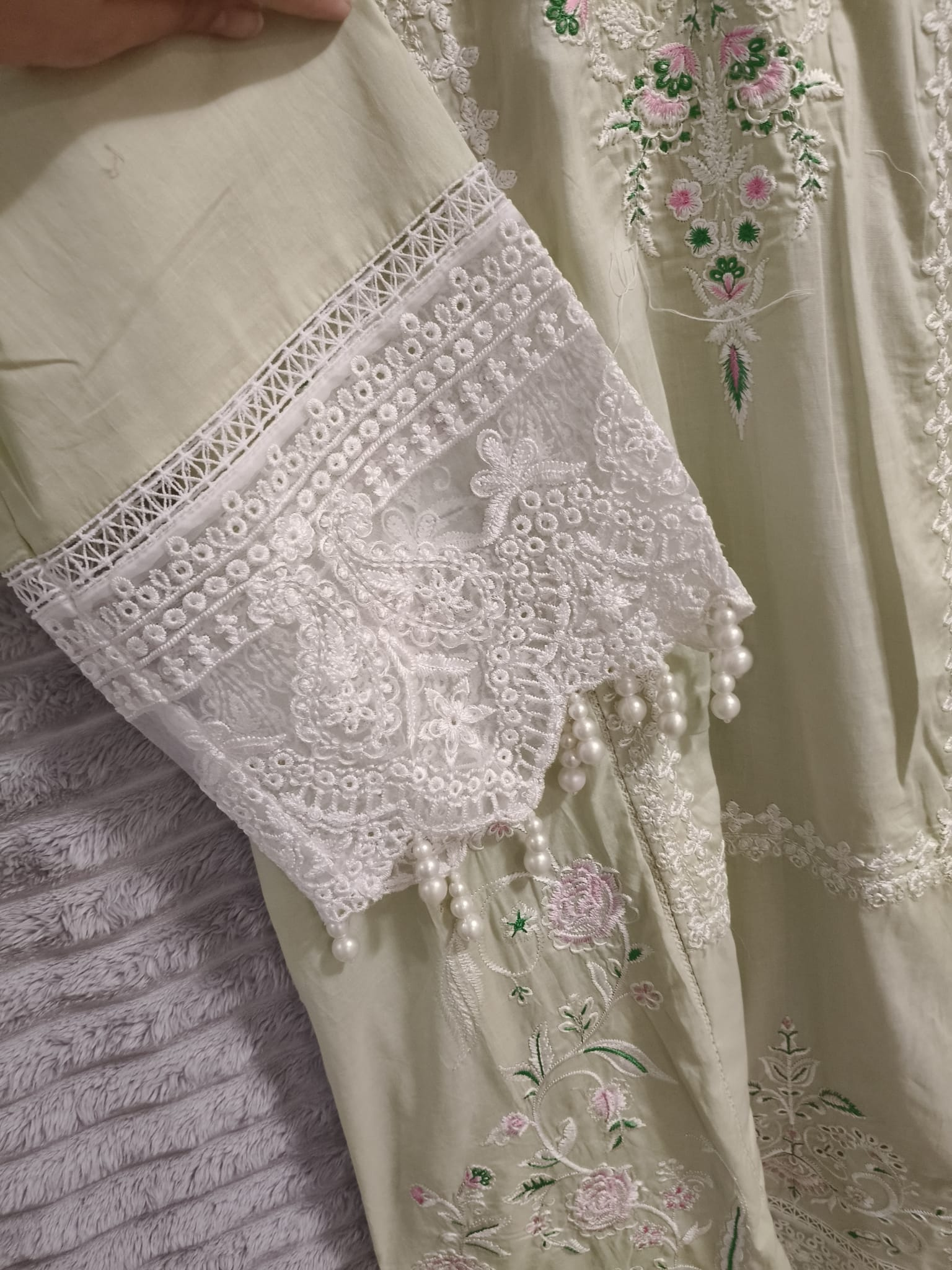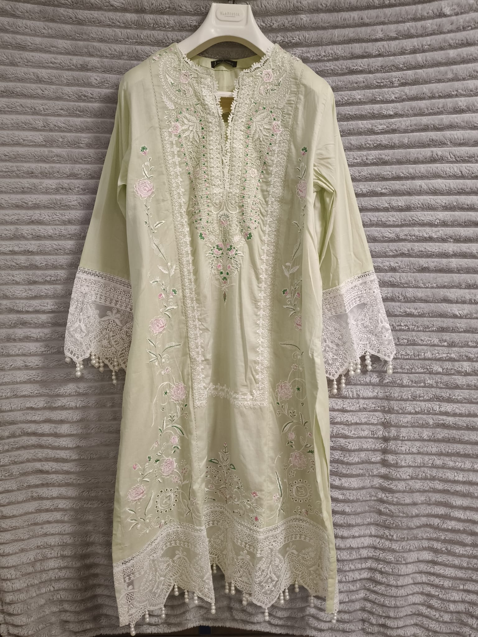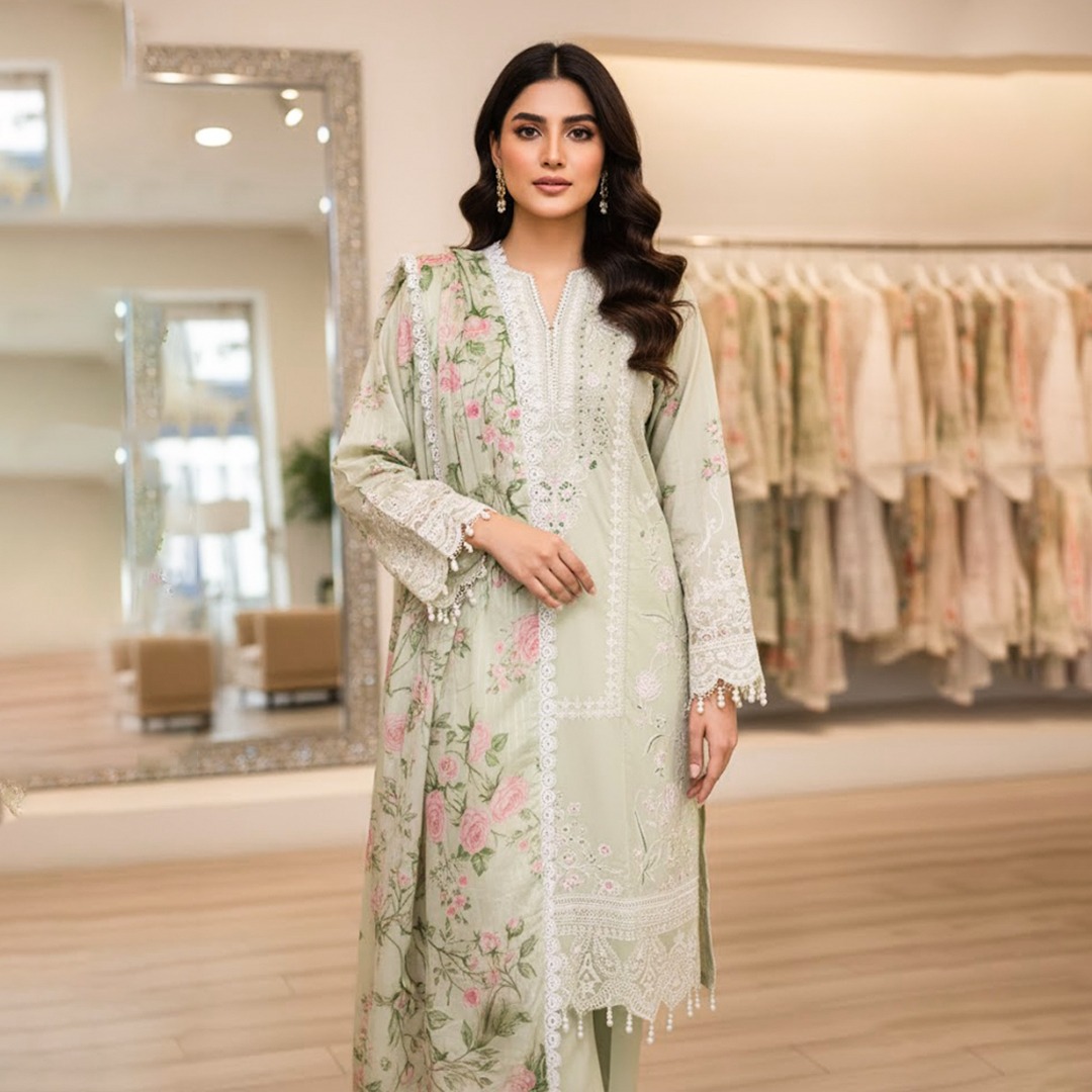 Pistachio Bloom by J. is a luxury stitched 3-piece suit that radiates elegance and artisanal finesse. The kameez comes in a soft pistachio green shade, adorned with dense Chicken Kari embroidery, pastel floral threadwork, and bead detailing. Its scalloped hemline and lace-finished cuffs elevate its festive charm. The coordinating dupatta, likely chiffon or organza, features scattered embroidery with fine border work, offering a lightweight and luxurious drape. Paired with matching straight-cut trousers, this ensemble blends traditional craftsmanship with modern tailoring. Designed for Eid, engagement functions, or intimate celebrations, it delivers exceptional value at $250 for its premium stitching, brand reputation, and hand-finished detailing. Available in sizes 16–14.