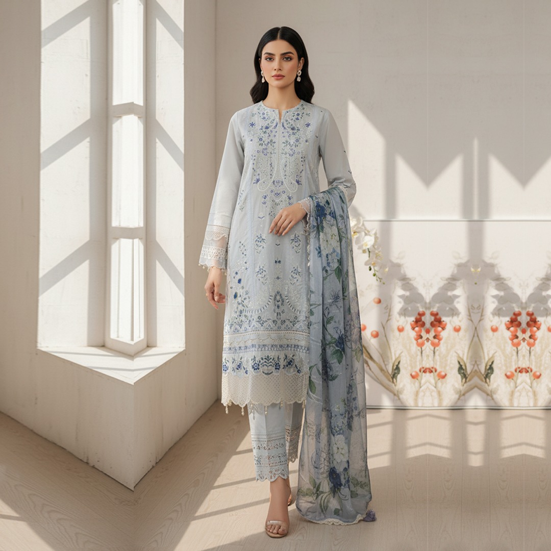 Exude elegance and grace with this powder blue embroidered lawn suit from RSL Fashion, designed for timeless sophistication. The beautifully detailed shirt features delicate white and blue embroidery with floral motifs and intricate lacework on the sleeves and hemline. The fine craftsmanship and subtle pastel palette make this outfit a stunning choice for daytime events or festive gatherings.
