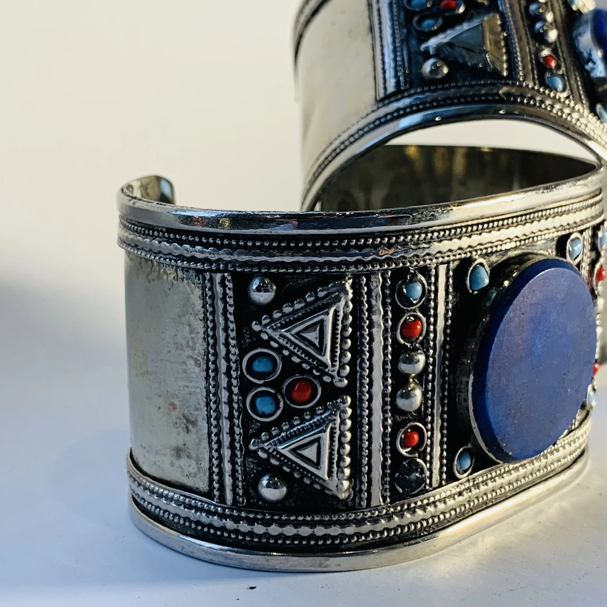 A bold vintage Afghan bracelet featuring deep blue lapis, vibrant red accents, and ornate silverwork, inspired by Kuchi and Turkmen tribal design—perfect for stacking or wearing solo.